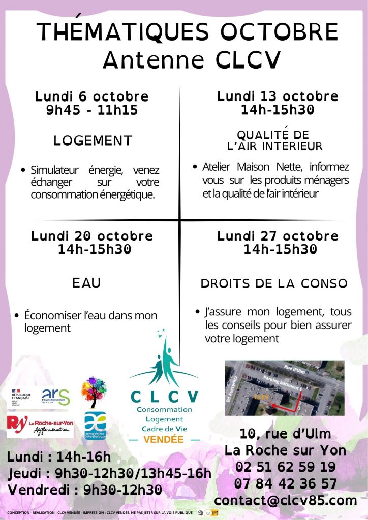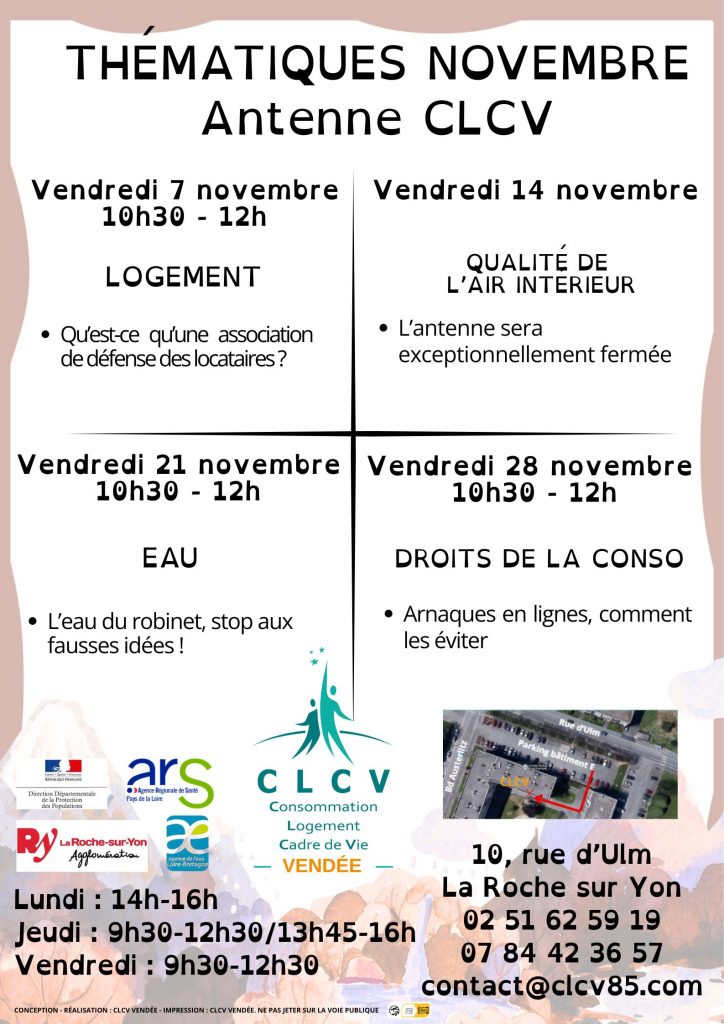 La CLCV Vendée est une association de défense des consommateurs qui œuvre pour la protection des droits des consommateurs et l’amélioration de leur cadre de vie. Nous donnons des conseils, des informations et un accompagnement juridique sur des thématiques variées : logement, consommation, énergie, et cadre de vie. Nous sensibilisons également à une consommation responsable et soutenons les habitants dans la gestion de leurs litiges avec les entreprises. En tant qu’acteur local, la CLCV intervient pour défendre un cadre de vie plus équitable et durable, en collaborant avec les collectivités et autres acteurs locaux.