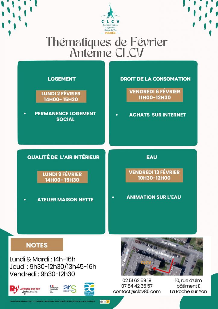 La CLCV Vendée est une association de défense des consommateurs qui œuvre pour la protection des droits des consommateurs et l’amélioration de leur cadre de vie. Nous donnons des conseils, des informations et un accompagnement juridique sur des thématiques variées : logement, consommation, énergie, et cadre de vie. Nous sensibilisons également à une consommation responsable et soutenons les habitants dans la gestion de leurs litiges avec les entreprises. En tant qu’acteur local, la CLCV intervient pour défendre un cadre de vie plus équitable et durable, en collaborant avec les collectivités et autres acteurs locaux.